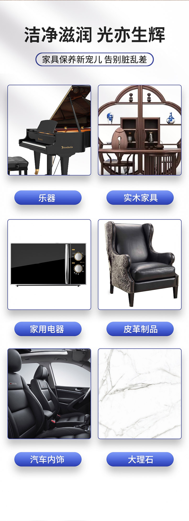 產(chǎn)品范圍:皮革、實木家具、汽車內(nèi)飾、家用電器